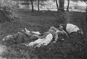 Конвой далі гнав невинні жертви. Загони більшовиків, які відступали з Лубен тією ж дорогою, вслід, жорстоко добивали багнетами поранених, які видавали себе стогонами; знімали з них чоботи, одяг... Усе це бачили двоє названих ченців, що встигли відповзти й заховатися в кущах.