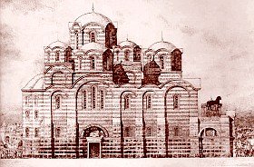Другой достойный сын его, Ярослав, ознаменовал свое многолетнее царствование сооружением многих храмов. Важнейший из них — храм Киево-Софийский. В 1036 г., когда великий князь находился в Новгороде, он получил известие, что печенеги обступили Киев. Собрав многих воинов из варягов и новгородцев, Ярослав поспешил в свою столицу и здесь, присоединив к ним еще дружину киевскую, выступил против врагов, которых было несметное число. Злая сеча продолжалась целый день, и едва к вечеру Ярослав одолел. Преследуемые печенеги побежали в разные стороны, и одни из них потонули в реках, другие рассеялись, так что с того времени уже не беспокоили Россию. В память столько важной и благодетельной для отечества победы Ярослав и заложил великолепный каменный храм во имя святой Софии, или Ипостасной Премудрости Божией Господа Иисуса, на том самом поле, где происходила битва, решившись распространить Киев гораздо далее прежней его черты. Этот храм, заложенный в 1037 г., но неизвестно когда оконченный и освященный, был построен по образцу знаменитого храма Софийского в Константинополе, только в гораздо меньшем размере и с некоторыми другими значительными отличиями. Внутри Киево-Софийская церковь была точно так же крестообразная, как и константинопольская, с галереями с трех сторон: западной, северной и южной, только в константинопольской верхние галереи были в два яруса, а у нас — в один. Восточная сторона нашего храма имела пять полукружий, а константинопольского — одно большое. Своды нашего храма и полати, или хоры, поддерживались колоннами, большею частик) сложенными из кирпича и только двумя мраморными при западном входе, тогда как в константинопольской церкви колонны все были мраморные. Наш собор имел, кажется, два боковых придела и, следовательно, три престола, а константинопольский — только один. Куполов на нашем соборе было тринадцать, тогда как на константинопольском — один купол дивной величины. При нашем соборе, как и константинопольском, находились крещальня и колокольня. Будучи, таким образом, подобием константинопольского Софийского храма по самому своему устройству, Киево-Софийская церковь подражала ему и в украшениях.