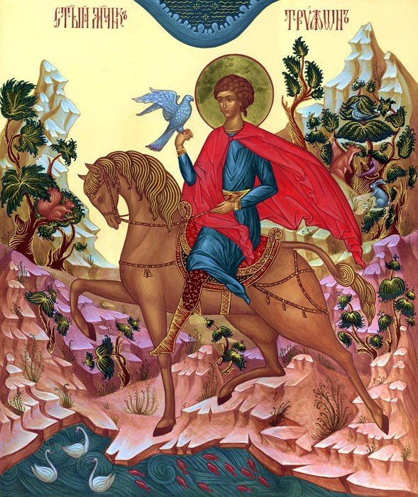 В России мученик Трифон изображается верхом на белом коне, с соколом в руках.