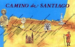 И наконец, самым популярным паломническим маршрутом, собиравшим огромный поток пилигримов, являлся «Путь святого Иакова» (El Camino de Santiago) — проложенная через всю Европу дорога к мощам святого Иакова в испанскую Компостелу, по имени апостола получившей название Сантьяго-де-Компостела. По преданию, после того, как апостол Иаков был схвачен во время проповеди в Иерусалиме и умерщвлен по приказу Ирода Агриппы, его мощи были положены его учениками в лодку и пущены по волнам Средиземного моря. Лодка же приплыла к берегу Испании, где его саркофаг, облепленный ракушками, был встречен христианами и перенесены в город Ириа-Флавиа. По прошествии нескольких веков, в 813 году, ковчег с мощами апостола Иакова был обнаружен местным отшельником Пелайо: он увидел указывающую на нужное место путеводную звезду и, после обретения мощей, назвал это место Компостела — Сampus stella или «Поле звезды». Первый храм над гробницей апостола был возведен в конце IX века по приказу астурийского короля Альфонса II Скромного. Мощи апостола были положены в серебряном ковчеге под главным алтарем собора; его алтарь вплоть до нашего времени украшает золотая раковина — символ Иакова, а над его гробницей находится статуя святого, усыпанная драгоценностями. Во времена Средневековья город святого Иакова в некогда незаметной испанской провинции стал одним из центров христианского паломничества, наряду с самим Иерусалимом и Римом. К нему было проложено два основных паломнических пути: Дорога Святого Иакова (Camino de Santiago), проходящая по Северной Испании, через Пиренеи; и Французская дорога (Camino Francs), также называемая Срединный путь. Паломничество в Компостелу получило невероятную популярность и среди европейской знати: в свое время по «Пути Святого Иакова» прошли и Эдуард I, английский король XIV века; и Иоанн (Жан) де Бриенн, иерусалимский король, регент Латинской империи XIII века; и Изабелла Кастильская, королева Кастилии и Леона XV века; а также Франциск Ассизский, католический святой XIII века, Ян ван Эйк, фламандский живописец раннего Возрождения и многие другие.