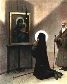 сидел на крыльце своего дома, грустя о разлуке с сыном. Вдруг необыкновенный свет озарил небосклон, и он увидел Матерь Божию и молящегося на коленях перед нею своего сына. Ангел Божий осенял его Архиерейской мантией |