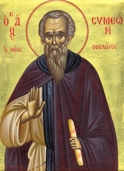 Преподобный Симеон Новый Богослов родился в 946 году в городе Галате (Пафлагония) и получил в Константинополе основательное светское образование. Отец готовил его к придворной карьере, и некоторое время юноша занимал высокое положение при императорском дворе. Но достигнув 25 лет, он почувствовал влечение к иноческой жизни, бежал из дома и удалился в Студийский монастырь, где проходил послушание под руководством знаменитого в то время старца Симеона Благоговейного. Основным подвигом Преподобного стала непрестанная Иисусова молитва в её кратком виде: «Господи, помилуй!» Для большей молитвенной сосредоточенности он постоянно искал уединения, даже на литургии стоял отдельно от братии, часто оставался один на ночь в церкви; чтобы навыкнуть в памятований о смерти, проводил ночи на кладбище. Со временем он достиг постоянной высокой духовной просветлённости, что особенно обнаруживалось, когда он служил Литургию.