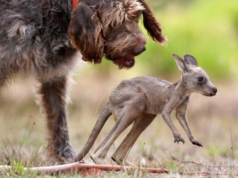Десятилетний пёс, немецкий пойнтер, спас четырёхмесячного кенгуру в Белс Бич Виктория, Австралия, после того как его родную мать сбил автомобиль.