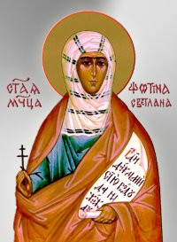 Святая мученица Фотиния (Светлана) была той самой самарянкой, с которой беседовал Спаситель у колодца Иаковлева. Во времена императора Нерона в Риме, в 65 году, проявившего чрезвычайную жестокость в борьбе с христианством, святая Фотиния жила с детьми в Карфагене и там безбоязненно проповедовала Евангелие. Слухи о христианке и ее детях дошли до Нерона, он приказал привести христиан на суд в Рим. Святая Фотиния, извещенная Спасителем о предстоящих страданиях, в сопровождении нескольких христиан отправилась из Карфагена в Рим и присоединилась к исповедникам. В Риме император спросил их, действительно ли они веруют во Христа?