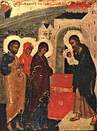 Потом Симеон обратился к Деве Марии и, предрекая Ее будущие душевные муки в связи со Страданием и Смертью Ее Сына, сказал: «Се лежит Сей на падение и на восстание многим во Израили, и в знамение пререкаемо: и тебe же Самой душу пройдет оружие. Яко да открыются от многих сердец помышления». При этом находилась и «Анна пророчица, дочь Фануилова, от колена Асирова, достигшая глубокой старости, прожив с мужем от девства своего семь лет, вдова лет восьмидесяти четырех, которая не отходила от храма, постом и молитвою служа Богу день и ночь. И она в то время, подойдя, славила Господа и говорила о Нем всем, ожидавшим избавления в Иерусалиме».