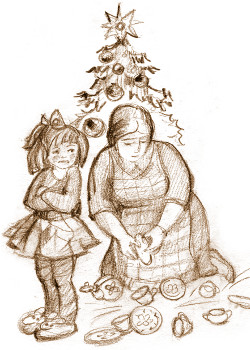 — Вот. Вот тебе подарок, — посуда осторожно переправилась в Машины руки. Девочка нетерпеливо открывает коробку и вдруг со злостью запускает ею в бабушку. Посуда не разбилась. Только разлетелась по пушистому паласу в разные стороны: блюдца, чайничек, ещё блюдце…