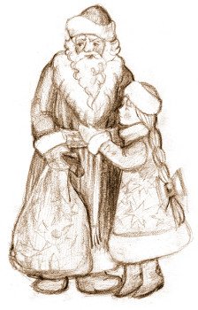 — Борода, — заговорчески прошептал он. — Там у меня борода, а ещё варежки, а ещё кушак и красная шуба с белой оторочкой.