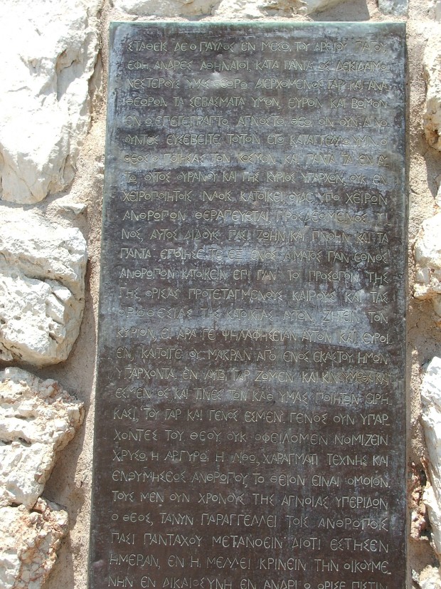 И вот, я гляжу с раскаленного летним солнцем Парфенона вниз и вижу большую каменную скалу внизу, и сердце моё сжалось: неужели это он? Потихоньку отделяюсь от своей экскурсионной группы, спускаюсь по Пропилеям, и вот я у цели. На холм ведет лестница явно не античных времен. Поднимаюсь — и чуть не падаю. Неровная скала до блеска отполирована, только небольшая часть древней ровной плиты осталась от того помоста, на который когда-то взошел бодрыми пружинистыми шагами странный человек из беспокойного племени в Средиземноморье, того племени, что не просто размышляло о Едином Боге, но вера в Которого составляла самое существо их жизни.