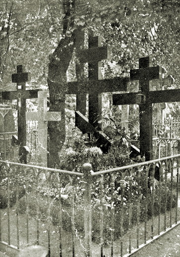 Средний крест, под которым именно и покоятся дорогие останки пастыря — несколько больше других крестов; справа от него стоит крест над могилкой его супруги, скончавшейся около тридцати лет тому назад; а слева крест, на котором художественно написано Распятие, стоит над могилкой сестры супруги батюшки, которая до самой своей кончины (25 мая 1904 года) жила в семействе батюшки.