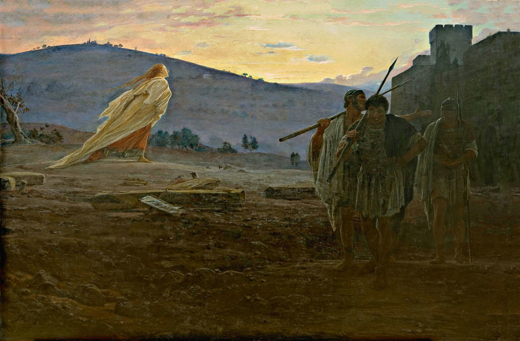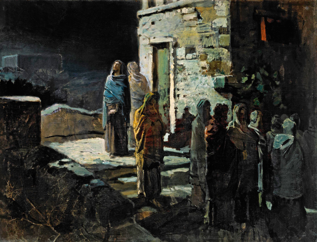 Вот наступает час, и настал уже, что вы рассеетесь каждый в свою сторону и Меня оставите одного (Ин 16:32) — кажется, эти евангельские слова озвучивают сцену, которую запечатлел Ге. Христос стоит на крыльце после Тайной Вечери, ученики спускаются, уходят в темень сада. В том, как они идут вереницей, «звучит» ритм похоронной процессии. Приближается время последних страданий Христа.