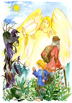 Разговаривая, путники прошли мимо старого, засохшего дерева, стоящего у самой дороги. Дерево было большое и мрачное. Казалось, что это и не дерево вовсе, а огромная когтистая лапа, нависшая над дорогой и готовая вот-вот схватить проходящего путника. Ерошка, оказавшись под тем деревом, невольно поежился, вроде как зябко стало, хоть и солнышко светило ярко. Он поднял голову вверх и увидел высоко на ветке больших черных воронов, старого и молодого. Птицы сидели, глядя с высоты на дорогу, что-то высматривая. Ерошка немного испугался, но набрался храбрости и даже погрозил им снизу кулаком, а потом припустил догонять деда. Вороны глядели молча на одиноких странников, и тут один из них, тот, что был помоложе, тяжело соскользнув с ветви, расправил большие черные крылья и уверенно направился на деда с внуком. Он подлетел к ним уже совсем близко, да вдруг с граем шарахнулся в сторону, будто кто-то невидимый отшвырнул его прочь могучей рукой. Ворон с криком стал подниматься ввысь, торопливо махая крыльями, только черные перья да пух остались кружиться в воздухе.