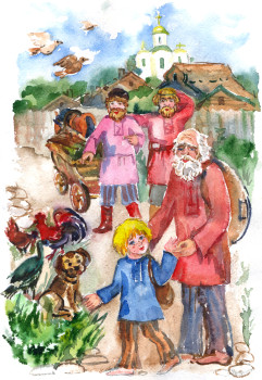 Они шли сквозь множество народа. Ярмарка кипела, всюду сновали люди: покупали и продавали, разносили пироги да блины. Но дед шел дальше. Вскоре они уже вышли на крайние ряды, где торговали мукой да крупой. Вдруг старик остановился.