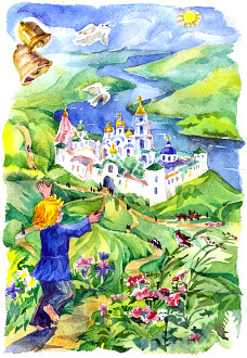 В монастыре ударили в колокол, и густой, чистый звон, наполняя мир, стал медленно подниматься к небу. «Бомм!» — казалась, сама земля гудела вместе с колоколом. «Бомм!» — басили высокие холмы. «Бомм!» — вторили камни и утесы. «Бомм!» — звенели вокруг деревья и травы, пел ветер. Звон наполнил собой все вокруг. И тут сверху, с самого высокого неба, тихо-тихо отозвалось далеким перезвоном: «Динь! Донн! Динь! Донн!».